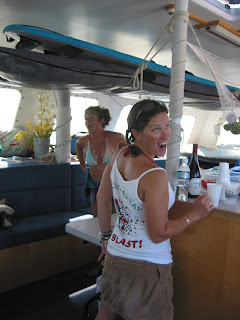 Everyone anchored in the marina, and headed ashore for good times and the annual meeting of the Punta Mita Surf and Sail Club… dinner and drinks at Margarittas and the Blue Water Grill. Then back to the boat for a quiet evening, hanging on the hook in Mexico. And despite the cervezas and tequillas, we still managed toget up pretty early and go catch some surf down the beach at La Lancha. Then it was back to the boat, and off on the run back to Paradise. Whales, dolphins, and 15 knots of breeze. Profligate loved the conditions, and we weren’t complainig at all either. Here she is (on a different day)…
