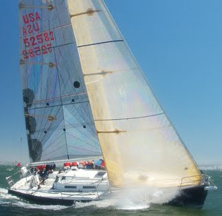 Small world: here’s a shot of our trusty blue boat in better days… this was in the 2008 Rolex Big Boat Series, on the way to a final position of third overall. See that guy up front, running the tack of the spinnaker out for a set? That is LT Kevin Sullivan up there.